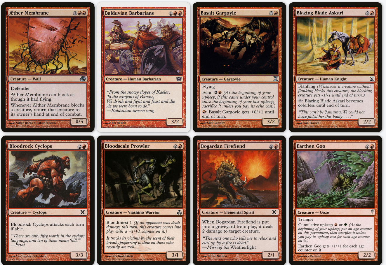 Aggro was very powerful at the time in spite of using a large number of very understatted creatures (especially relative to today). The successful aggro decks at US Nats 2007 (my benchmark event for this cube) are either using Greater Gargadon to cash out their little guys into meaningful pressure or ramping out large pump spells onto hexproof creatures to evade interaction. I’ve doubled down on Gargadon and Keldon Marauders to help these decks succeed and to make the deck more apparent, and am including Fallen Ideal as more of a signpost than a card I expect to see played every draft. Combo has been basically nonpresent, and I’m not sure how much of that comes down to knowledge vs opportunity vs actual power. Chord and the single copies of combo creatures present some chokepoints, and if any of them end up unplayed, the associated decks are more or less dead. I’ve added Loaming Shaman to try and shore this up already, and in the final update duplicated Saffi, Vesuvan Shapeshifter, and Wall of Roots. Dragonstorm has disappointed, generally not coming together while multiple players have tried to play cards like Seething Song and Lotus Bloom in decks that aren’t well suited. I want to revisit this at some point in the future because of how iconic the storm decks are, but walking the tightrope between trap archetype and overpowered spell combo deck is a bit too scary to try and solve for CubeCon. I’m aiming to ramp up a Magnivore spells archetype to fill this void a little and encourage some more competition over the blue resources with the UB value pile - this is what I’m most nervous about with the current list, but hopefully it works out!